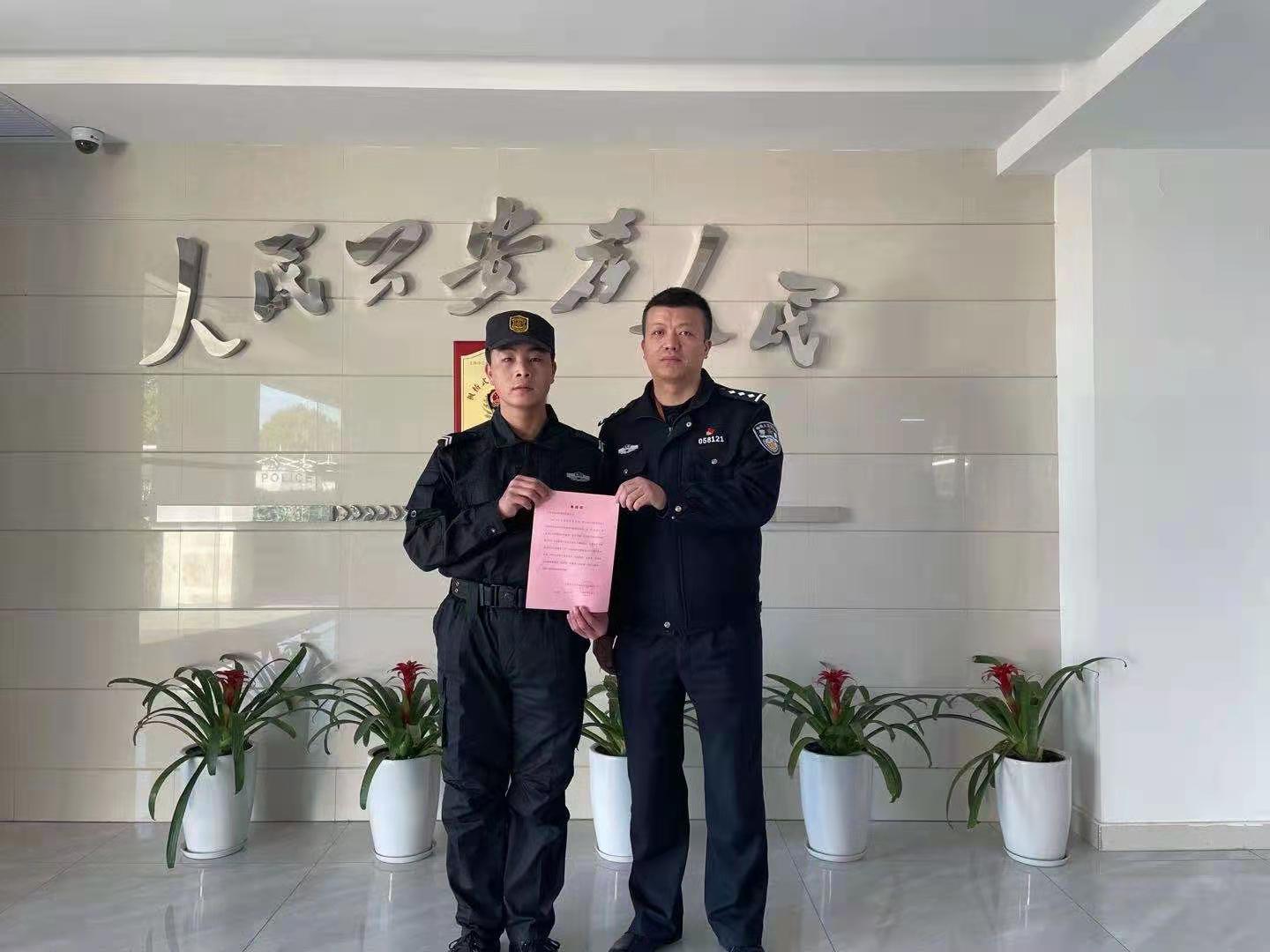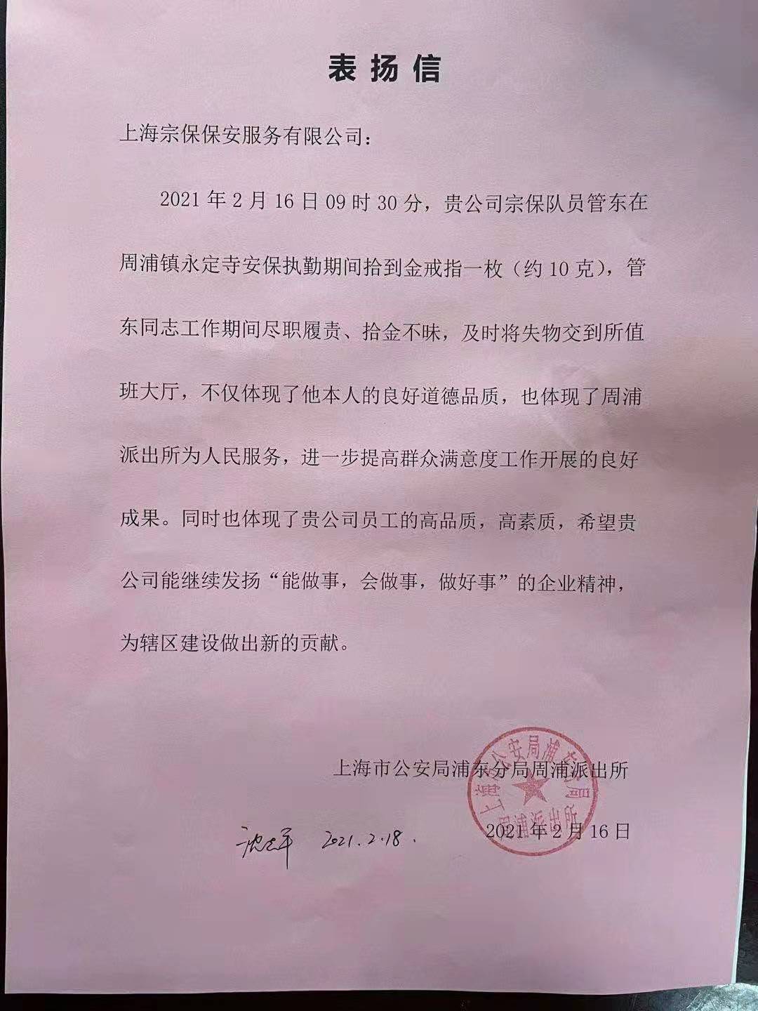 2月16日,宗保公司駐周浦輔警項目隊員管東收到浦東分局周浦派出所送來(lái)的一封表?yè)P信,信中對他拾金不昧的行為提出了表?yè)P。