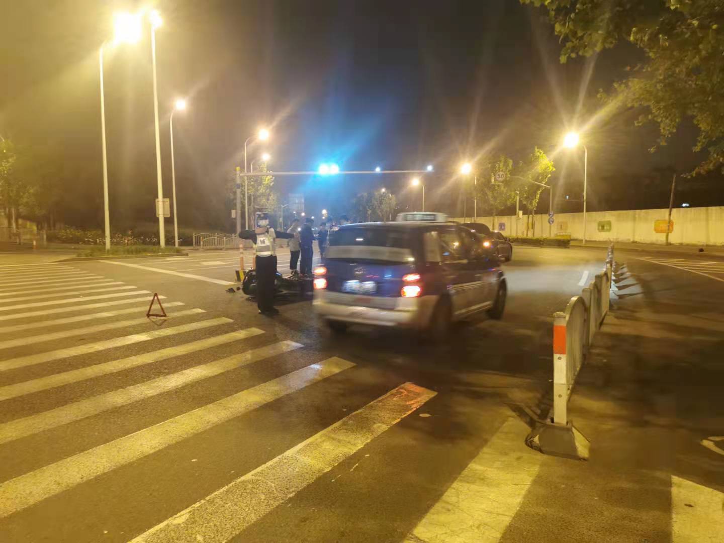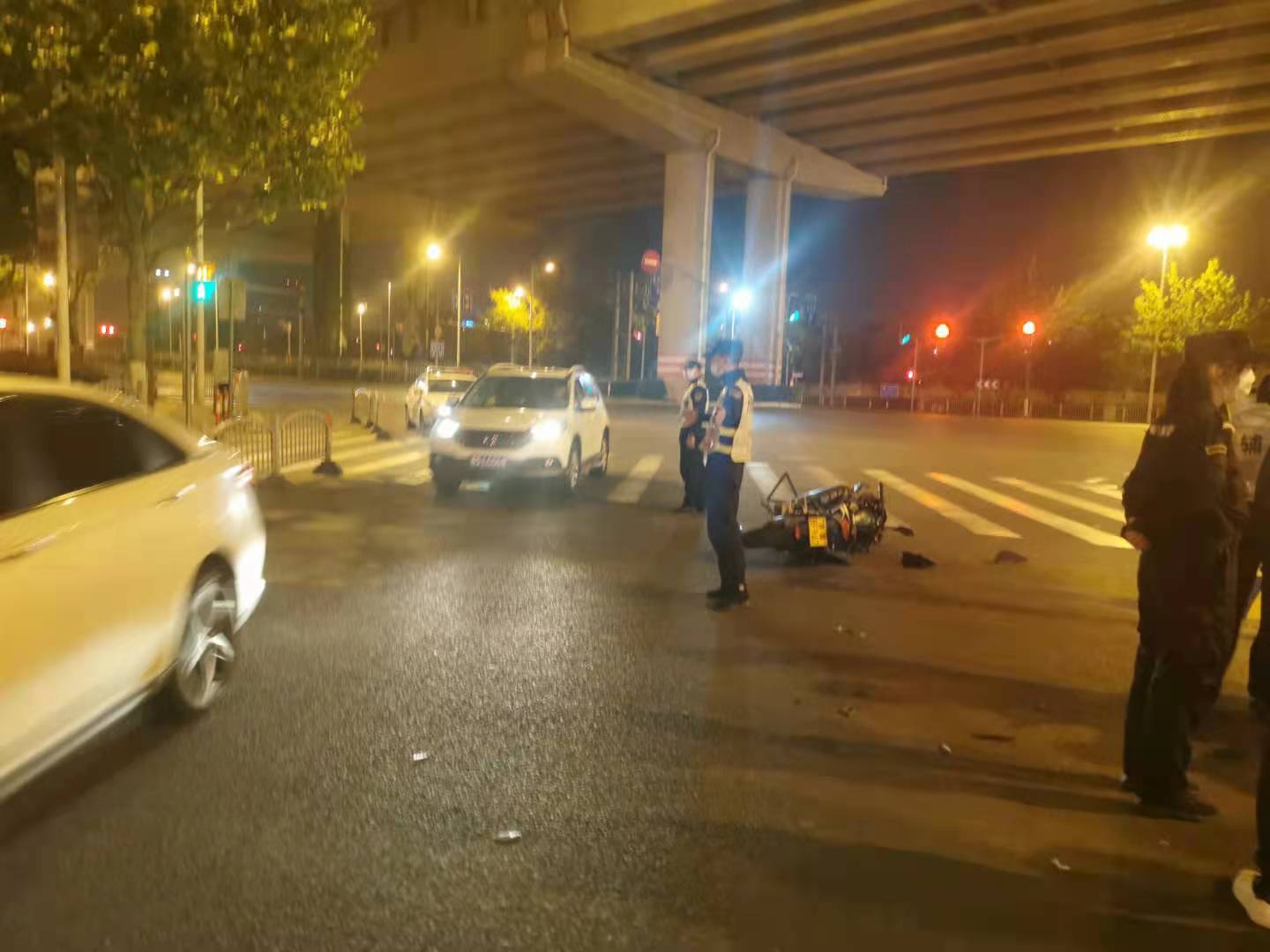 當天23:30,駐金橋派出所夜班巡邏隊員張港、賴(lài)作利巡邏至錦繡東路近金橋路時(shí),發(fā)現前方路口發(fā)生交通事故,便立即上前查看,一摩托車(chē)駕駛員由于拐彎速度過(guò)快與對向正在行駛的一輛轎車(chē)相撞。