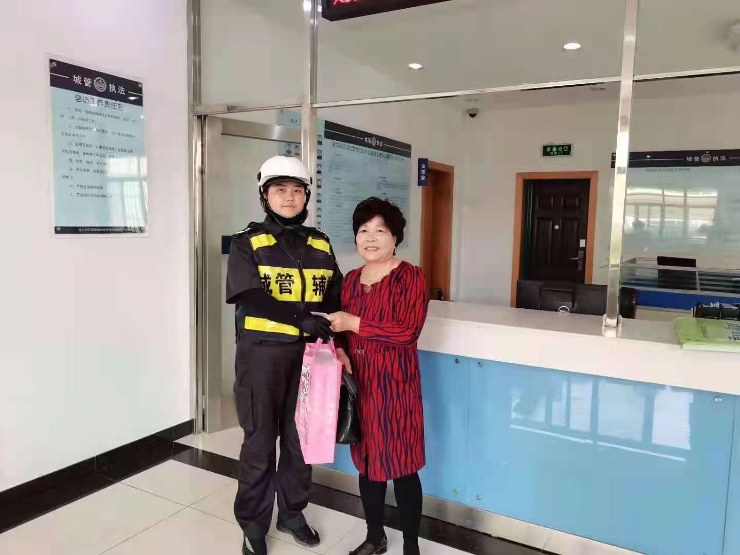 16:05左右,一位阿姨急匆匆趕來(lái),好像是在尋找什么。曹秋霞見(jiàn)狀,主動(dòng)上前詢(xún)問(wèn)是不是丟了東西,阿姨說(shuō)自己丟了一個(gè)手提袋,描述的袋內裝的東西和她撿到的東西一模一樣。確認阿姨是失主后,曹秋霞將阿姨帶到周浦城管中隊,把手提袋歸還給了阿姨。
