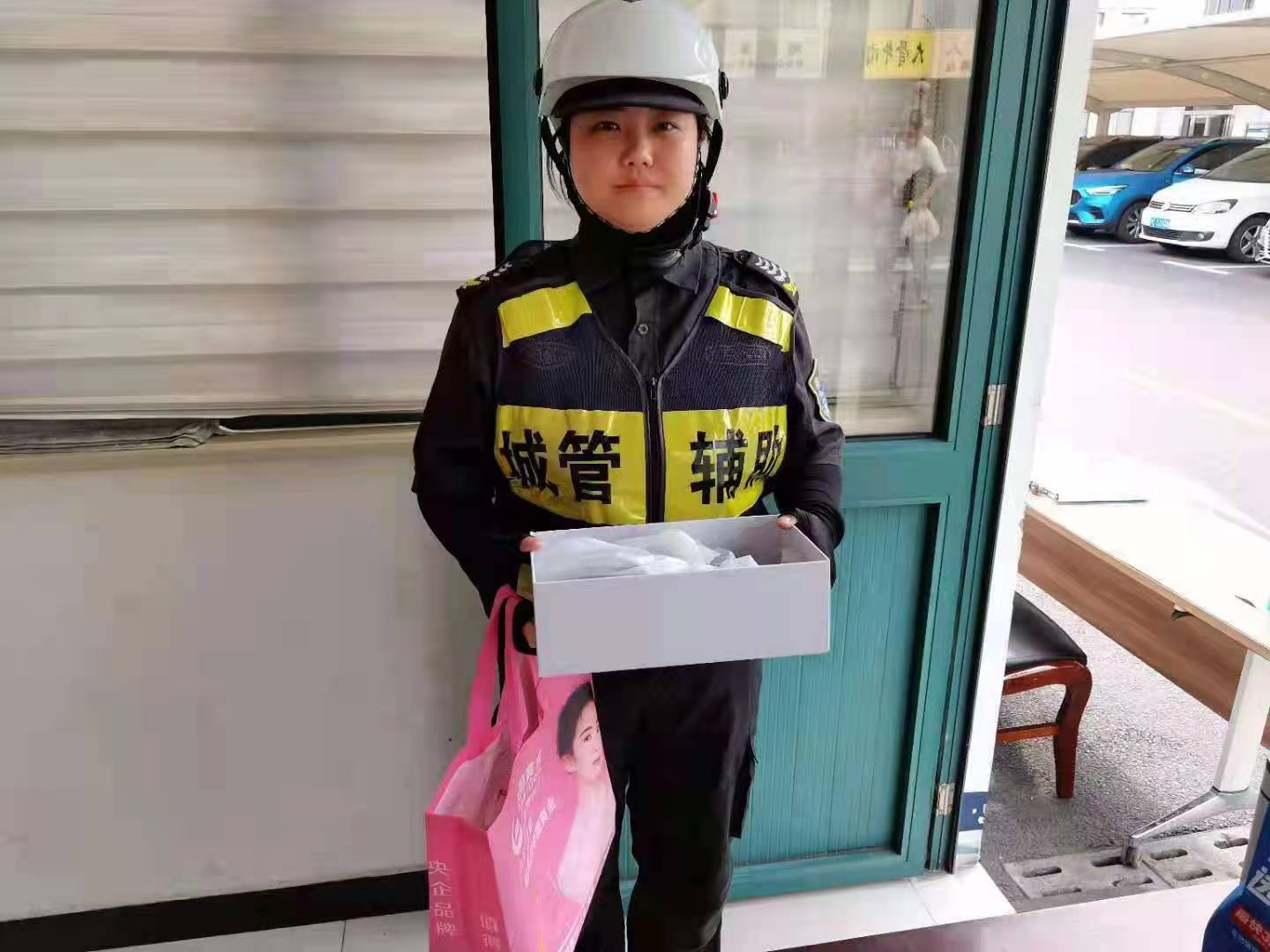 當天15:30,曹秋霞巡邏至小上海步行街時(shí),在路邊撿到一個(gè)手提袋,袋內有一雙嶄新的女士皮鞋和兩盒禮品??紤]到失主可能會(huì )回來(lái)尋找,便在原地等候。半個(gè)小時(shí)后,仍然沒(méi)有人前來(lái)尋找,曹秋霞便將手提袋送交到周浦城管中隊窗口,然后回到崗位繼續巡邏。