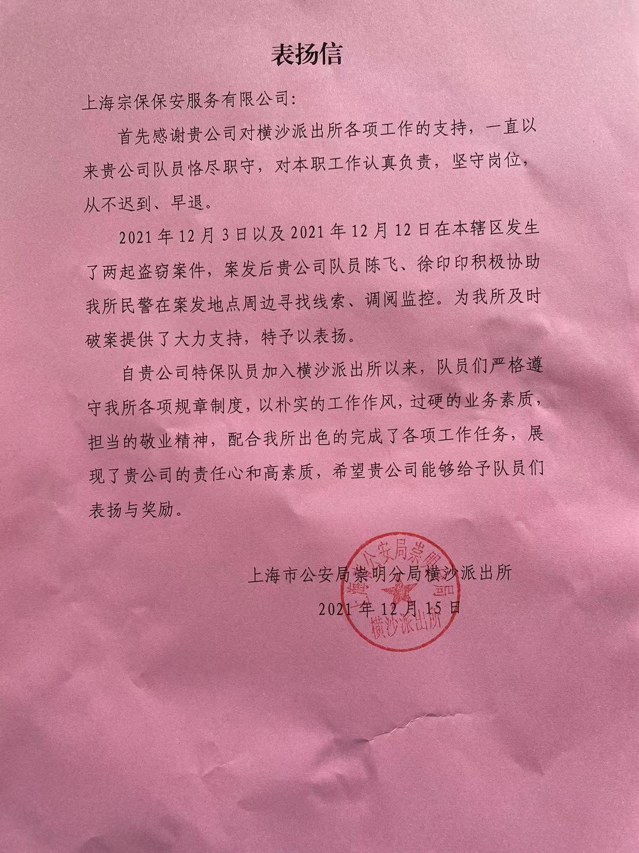12月15日,宗保公司駐崇明區橫沙鄉項目收到崇明區公安分局橫沙派出所的表?yè)P信,表?yè)P恪盡職守、工作負責的宗保隊員。