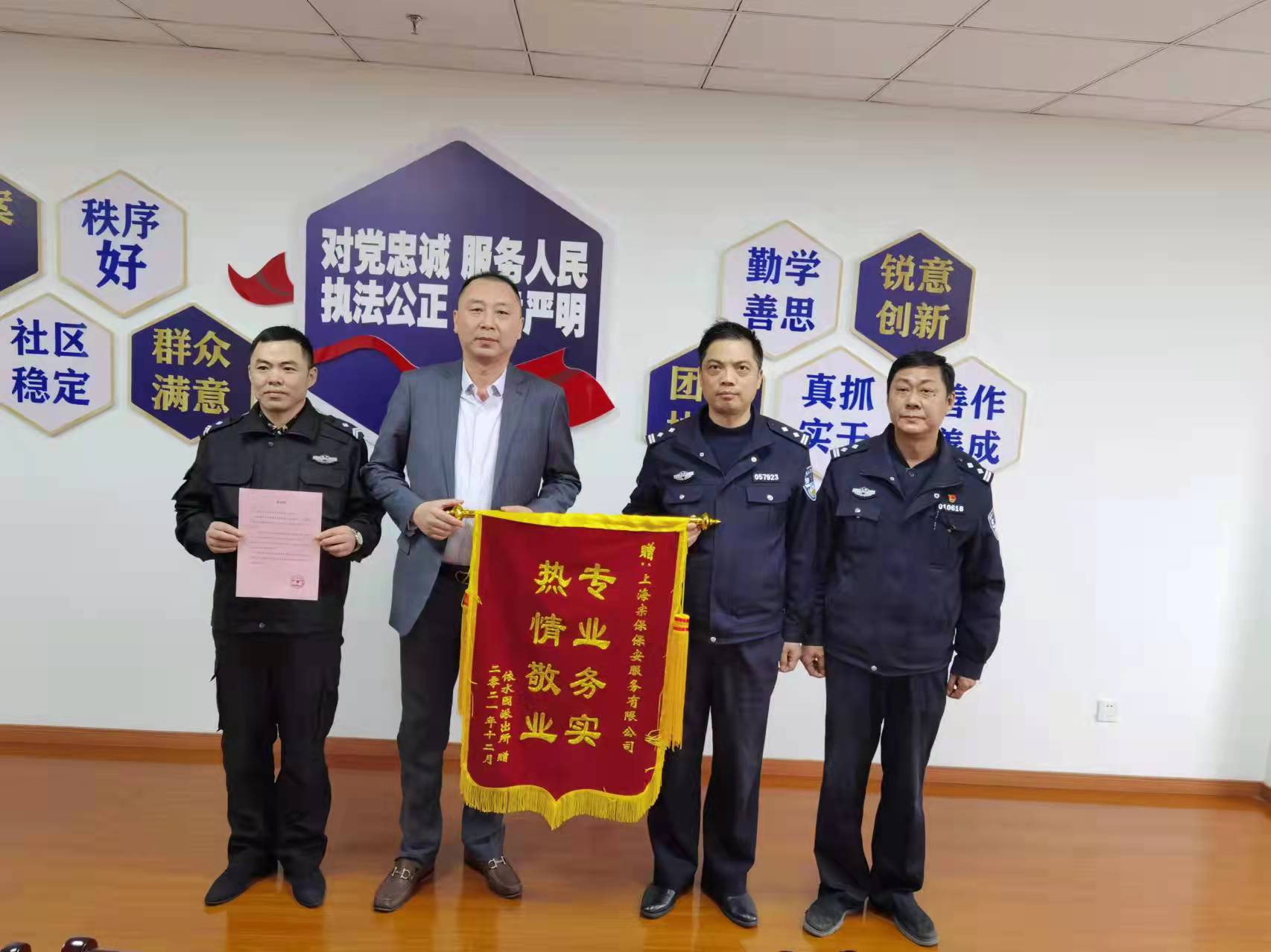 12月28日,浦東新區依水園派出所所長(cháng)施引軍和民警錢(qián)堅強向公司副總經(jīng)理王耀和項目負責人宮建華贈送繡有“專(zhuān)業(yè)務(wù)實(shí) 熱情敬業(yè)”的錦旗和表?yè)P信,表?yè)P項目特保隊員愛(ài)崗敬業(yè)、履職盡責的優(yōu)良表現。
