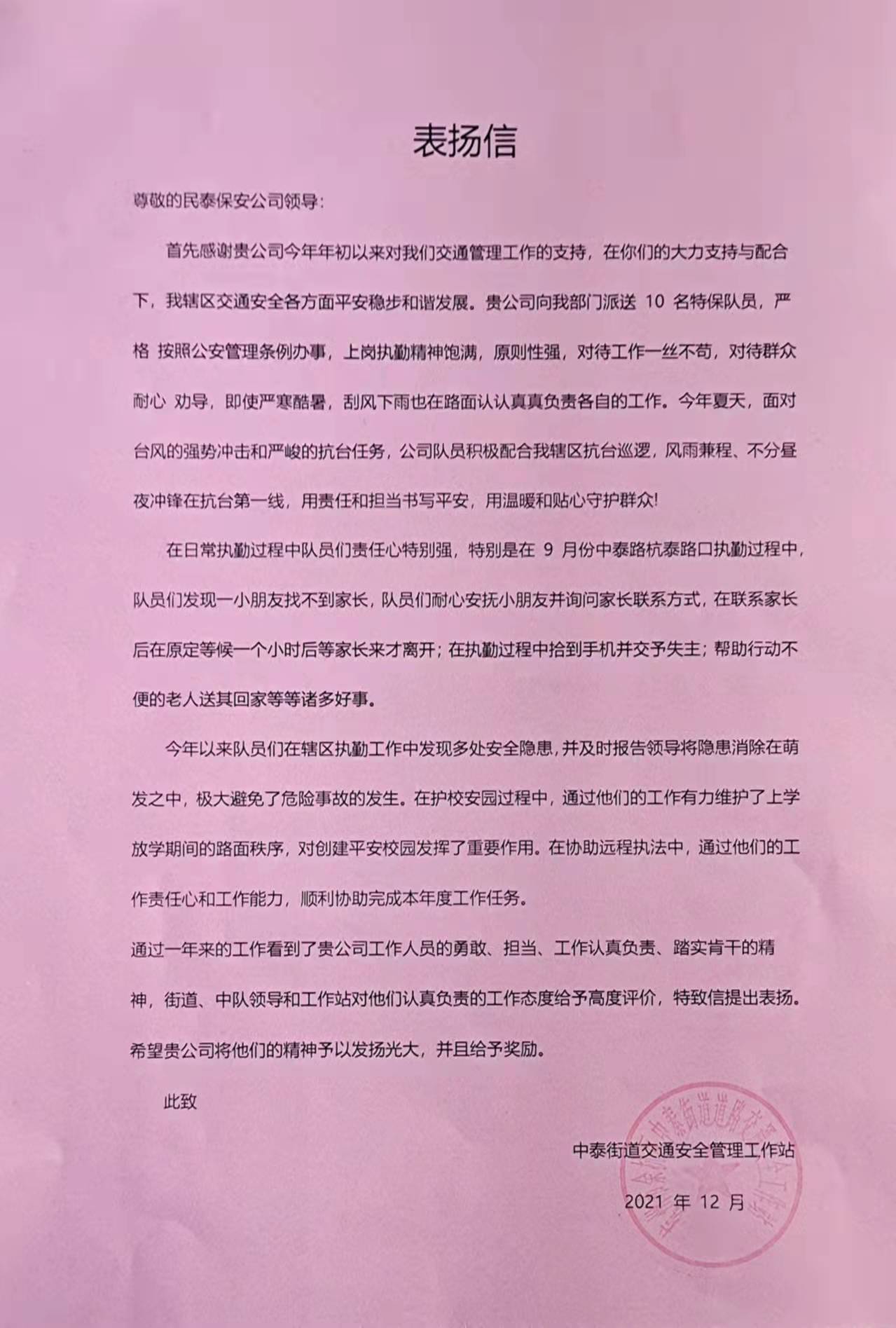 12月29日,浙江民泰駐中泰城管輔助項目收到余杭區中泰街道城管中隊副中隊長(cháng)王哲送來(lái)的表?yè)P信,信中對民泰隊員履職盡責的工作表現予以表?yè)P。