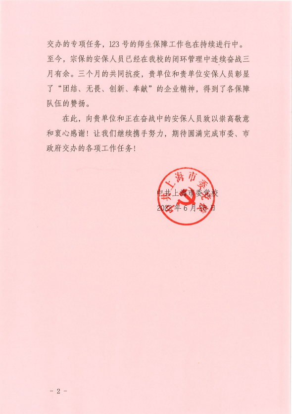 6月28日,中共上海市委黨校送來(lái)感謝信,感謝疫情防控期間宗保公司員工全力配合市委黨校為醫務(wù)人員提供有力的服務(wù)保障。