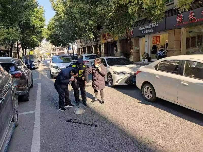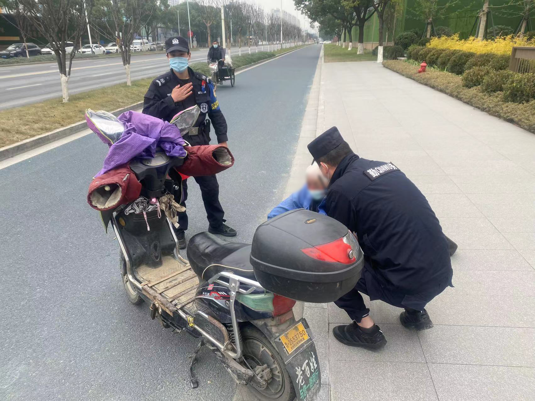 當日13:40,公司員工姜航和凌紹凱駕駛巡邏車(chē)在良渚新城好運街與小洋壩路附近巡邏時(shí),發(fā)現一位老人摔倒在地,一輛電瓶車(chē)壓在老人的身上。