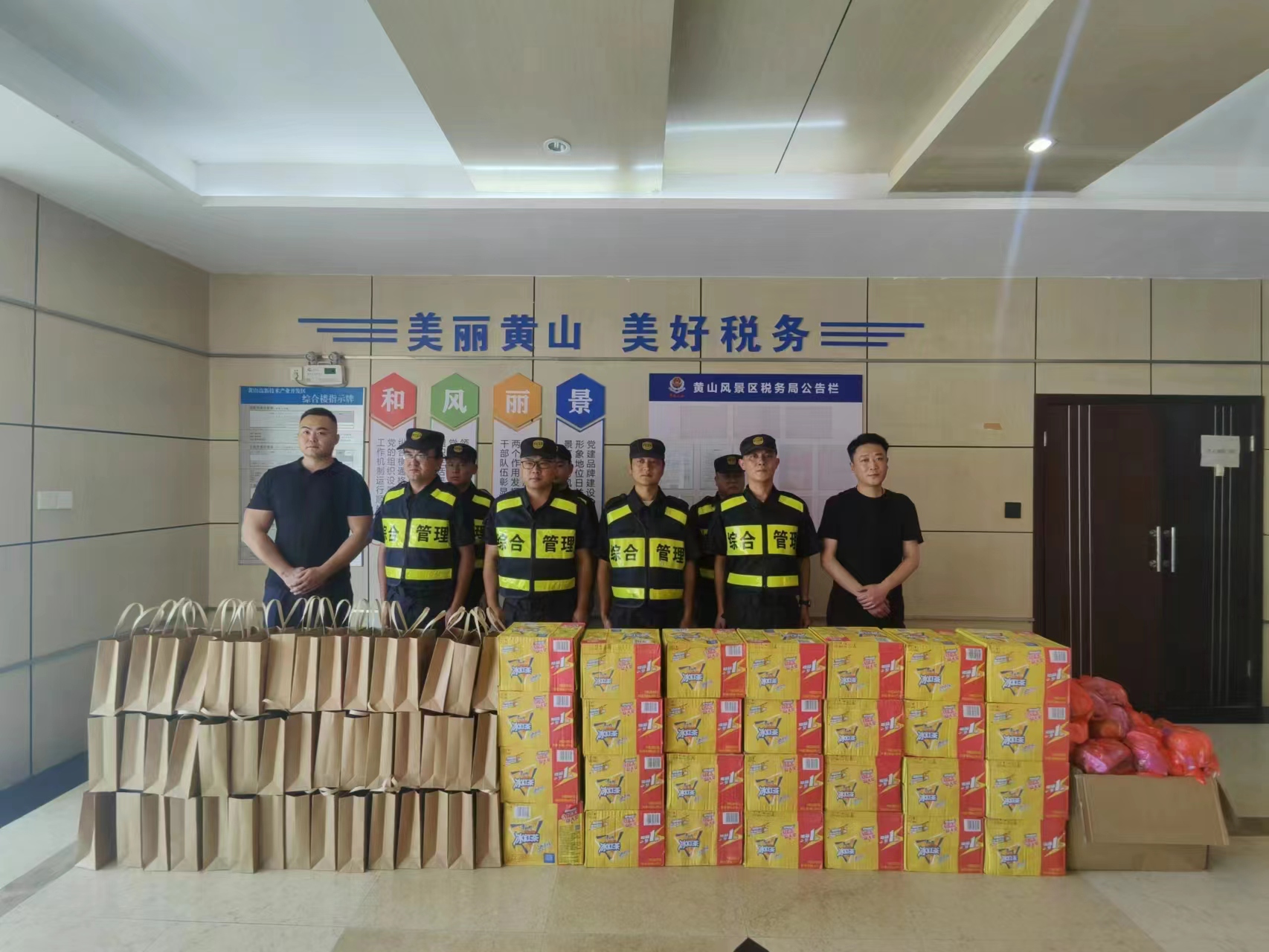 8月15日,安徽省黃山市高新區管委會(huì )文明辦主任許振東一行看望慰問(wèn)宗保公司駐高新區市容項目員工,為員工們送上飲料等防暑降溫用品,肯定大家在配合高新區管委會(huì )開(kāi)展文明創(chuàng )建和控違工作中所做的工作,感謝大家為高新區城市建設發(fā)展所付出的辛苦努力。