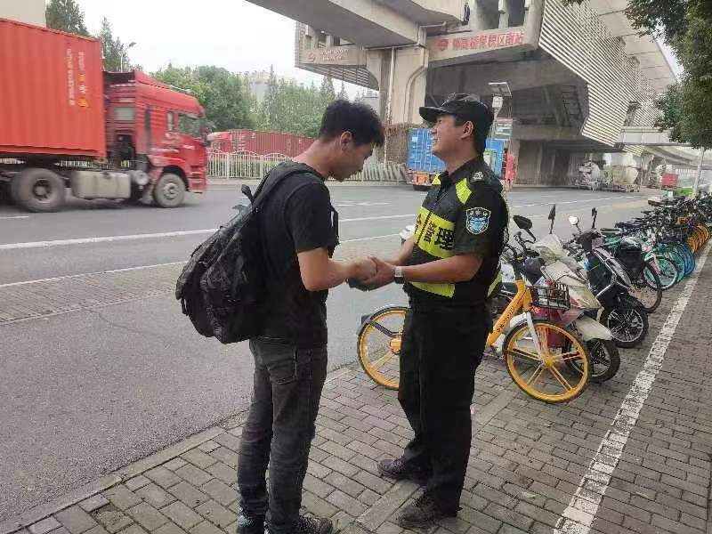 9月27日,宗保公司駐浦東新區高行市容項目員工程陽(yáng)明在外高橋保稅區南站地鐵站2號口整理共享單車(chē)時(shí),在一輛共享單車(chē)的車(chē)筐里發(fā)現一部黑色蘋(píng)果手機,詢(xún)問(wèn)旁邊人員無(wú)果后,隨即將情況報告了當班組長(cháng),并按指示守在原地等待。大約過(guò)了10分鐘左右,一男子打來(lái)電話(huà)尋找手機,程陽(yáng)明簡(jiǎn)單了解情況后,便與男子約好碰面的時(shí)間地點(diǎn)。又過(guò)了20多分鐘,一位身穿黑色上衣的男子急急忙忙應約趕來(lái)。程陽(yáng)明看他成功解鎖手機密碼后,便將手機交還給了他。男子拿著(zhù)手機,連連向程陽(yáng)明道謝。