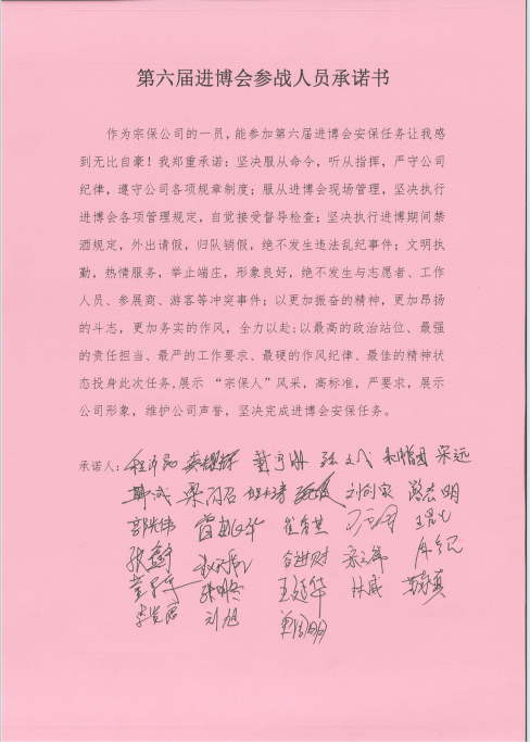 10月24日,公司舉行進(jìn)博會(huì )安保誓師動(dòng)員大會(huì ),參加安保的員工簽訂承諾書(shū),人人作出莊重承諾。隨后,根據進(jìn)博會(huì )安保有關(guān)要求進(jìn)駐進(jìn)博園區,協(xié)助配合做好現場(chǎng)秩序維護、參博人員疏導、車(chē)輛進(jìn)出指引以及外圍虹橋樞紐周邊交通疏導、陸家嘴區域和接待區酒店周邊市容環(huán)境秩序維護等工作。