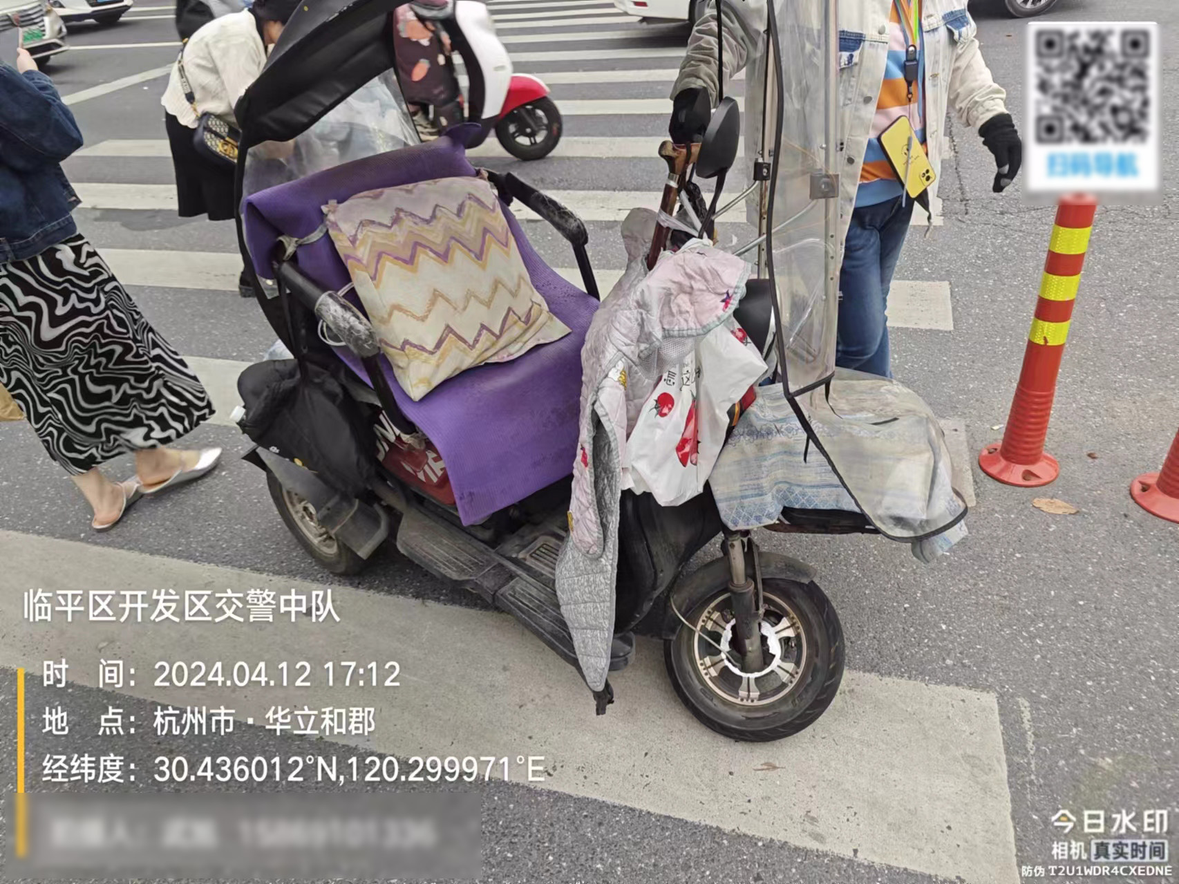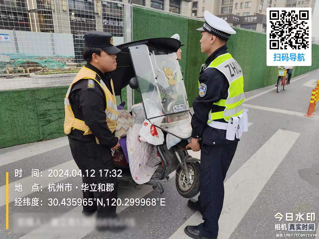 4月12日,浙江民泰公司駐杭州市臨平區東湖交管輔助項目員工熱心幫助代步車(chē)女士。