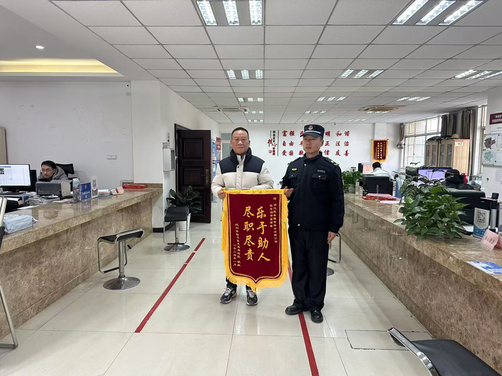 1月6日,浙江民泰公司駐杭州市臨平區東湖市容項目收到朱家角社區贈送的一面繡有“樂(lè )于助人 盡職盡責”的錦旗,感謝公司員工在助力社區開(kāi)展的街面流動(dòng)攤點(diǎn)占道經(jīng)營(yíng)、沿街商鋪跨店經(jīng)營(yíng)整治活動(dòng)中作出的積極貢獻。
