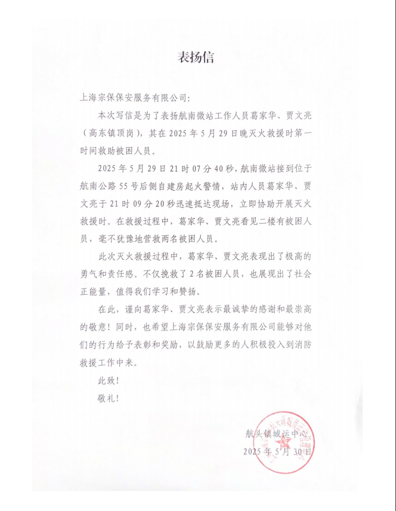 事后,航南微型消防站員工因第一時(shí)間救助被困人員受到了航頭鎮城運中心的通報表?yè)P。宗保公司參與聯(lián)建的微型消防站有效發(fā)揮了“救早、滅小”的優(yōu)勢,助力守護了人民群眾的幸福家園,為避免人民群眾生命財產(chǎn)遭受更大損失貢獻了力量。