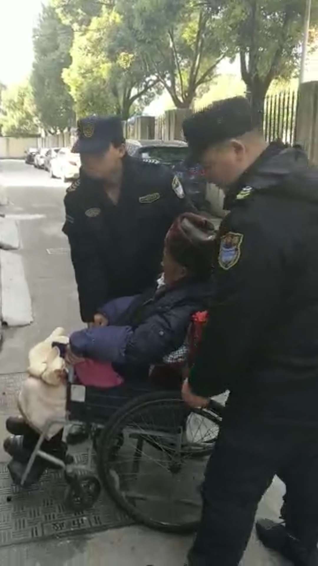 2018年12月18日12:30,宗保駐北蔡市容項目隊員們,在參加鎮政府保障蓮溪路北中路口,農民工討薪任務(wù)待命時(shí),發(fā)現在北中路上有一名推著(zhù)輪椅的老太太突然摔倒。帶隊組長(cháng)袁素東,隊員劉強,李建偉,馬正連4人立即上前對老人進(jìn)行攙扶幫助。在確認老人并無(wú)大礙后,隨即步行一公里左右,將老太太及坐在輪椅上的老大爺一起送回住處。