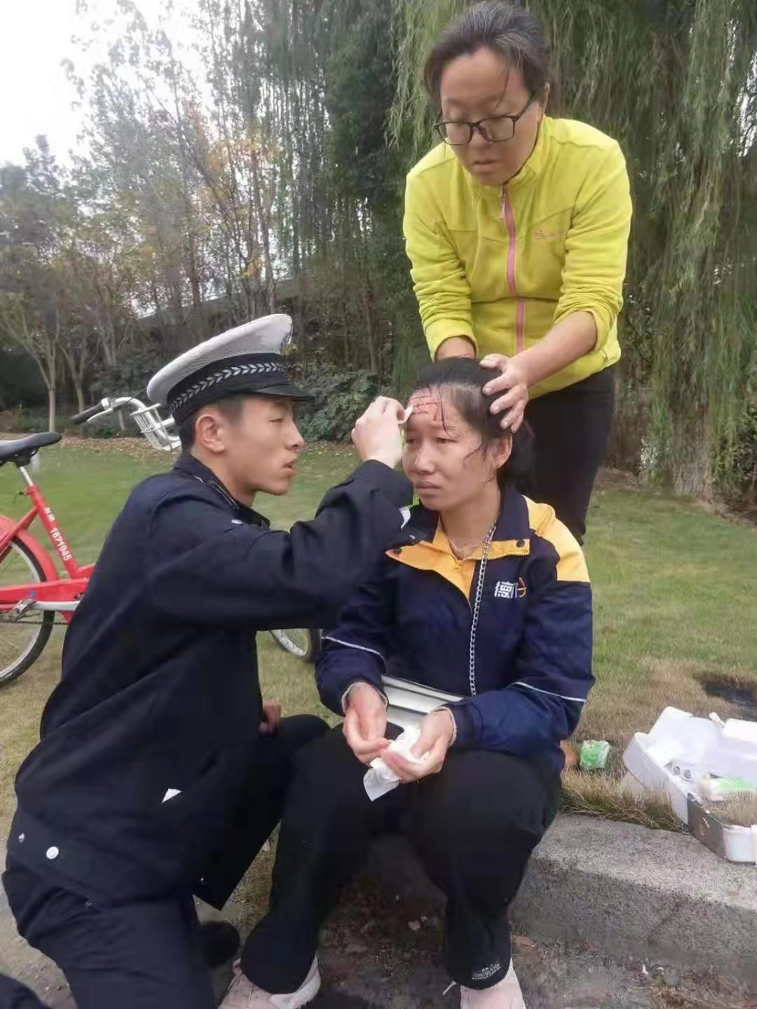 女子騎車(chē)摔傷 特保出手救助——良渚交通輔警項目隊員救助摔傷女子