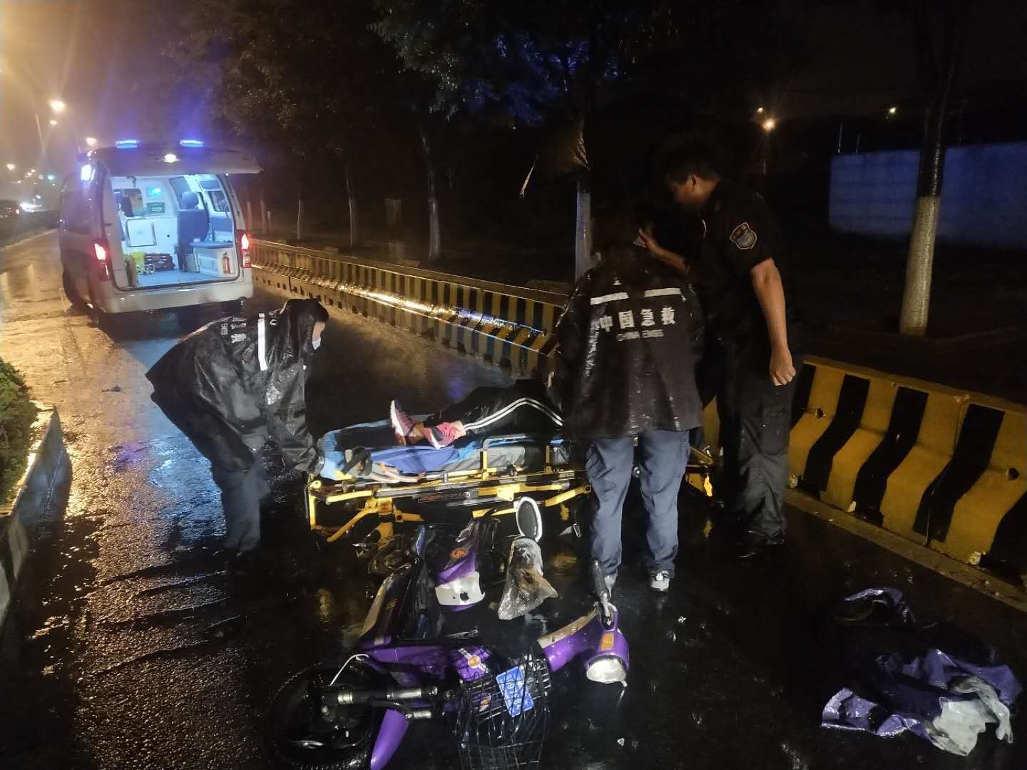 當晚22:30,大雨傾盆,能見(jiàn)度較差。李杰巡邏到申江路周祝公路時(shí),發(fā)現一輛電瓶車(chē)摔倒在地,一名女子躺在雨水中無(wú)法動(dòng)彈。