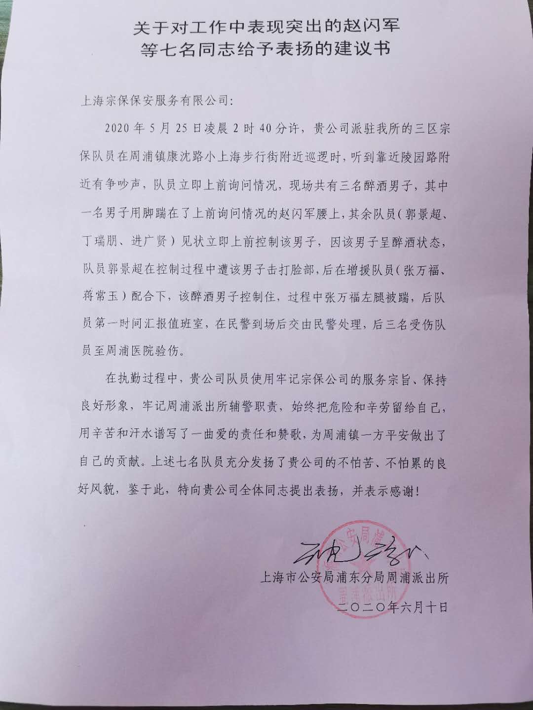 6月10日,宗保公司駐周浦派出所輔警項目收到周浦派出所送來(lái)的一封表?yè)P信,信中對周浦輔警項目隊員認真負責的工作態(tài)度,不怕苦、不怕累的工作精神給予充分肯定;對5月25日執勤中,趙閃軍等七名隊員打不還手、罵不還口規范文明執法的行為提出特別表?yè)P。
