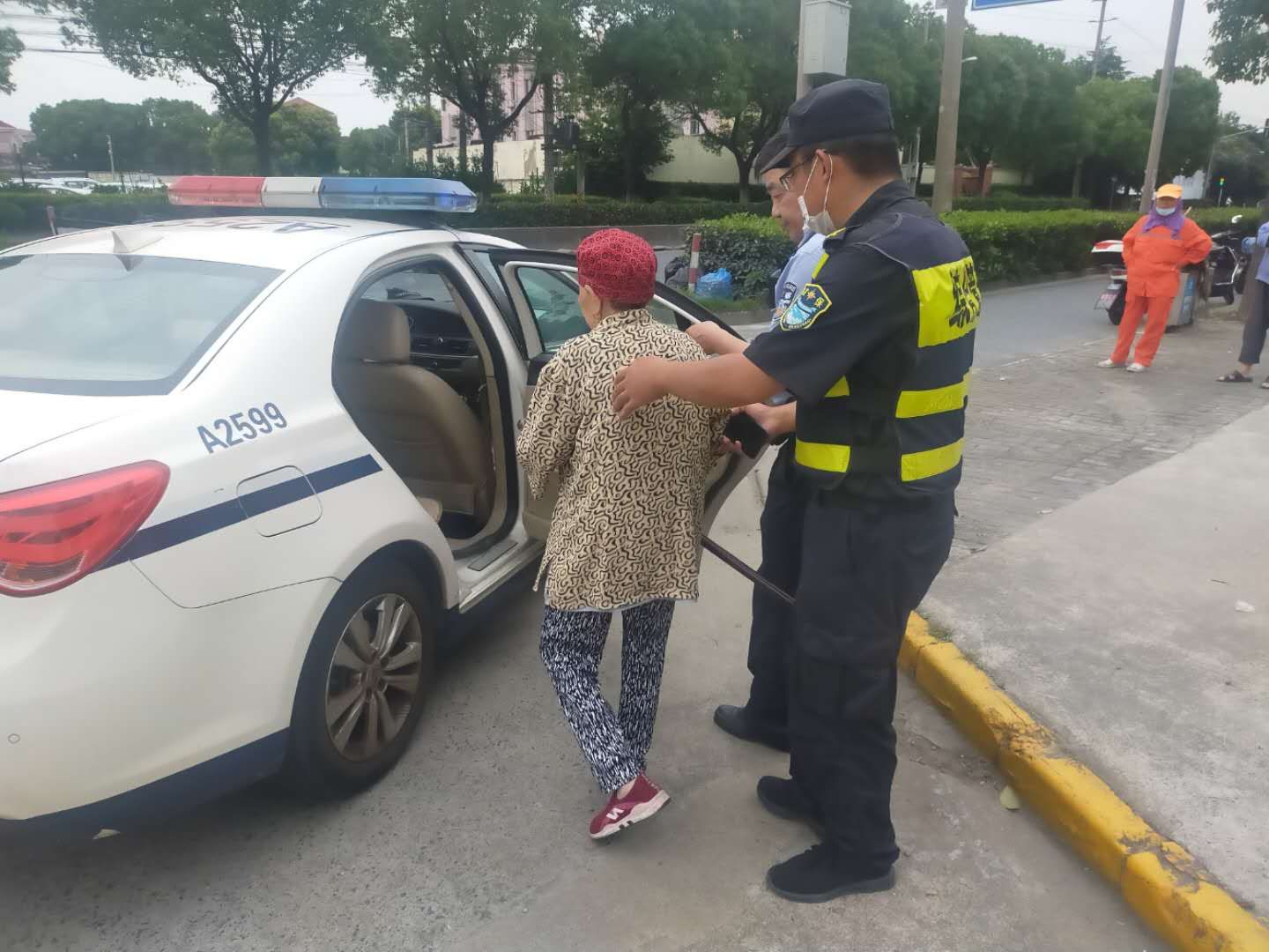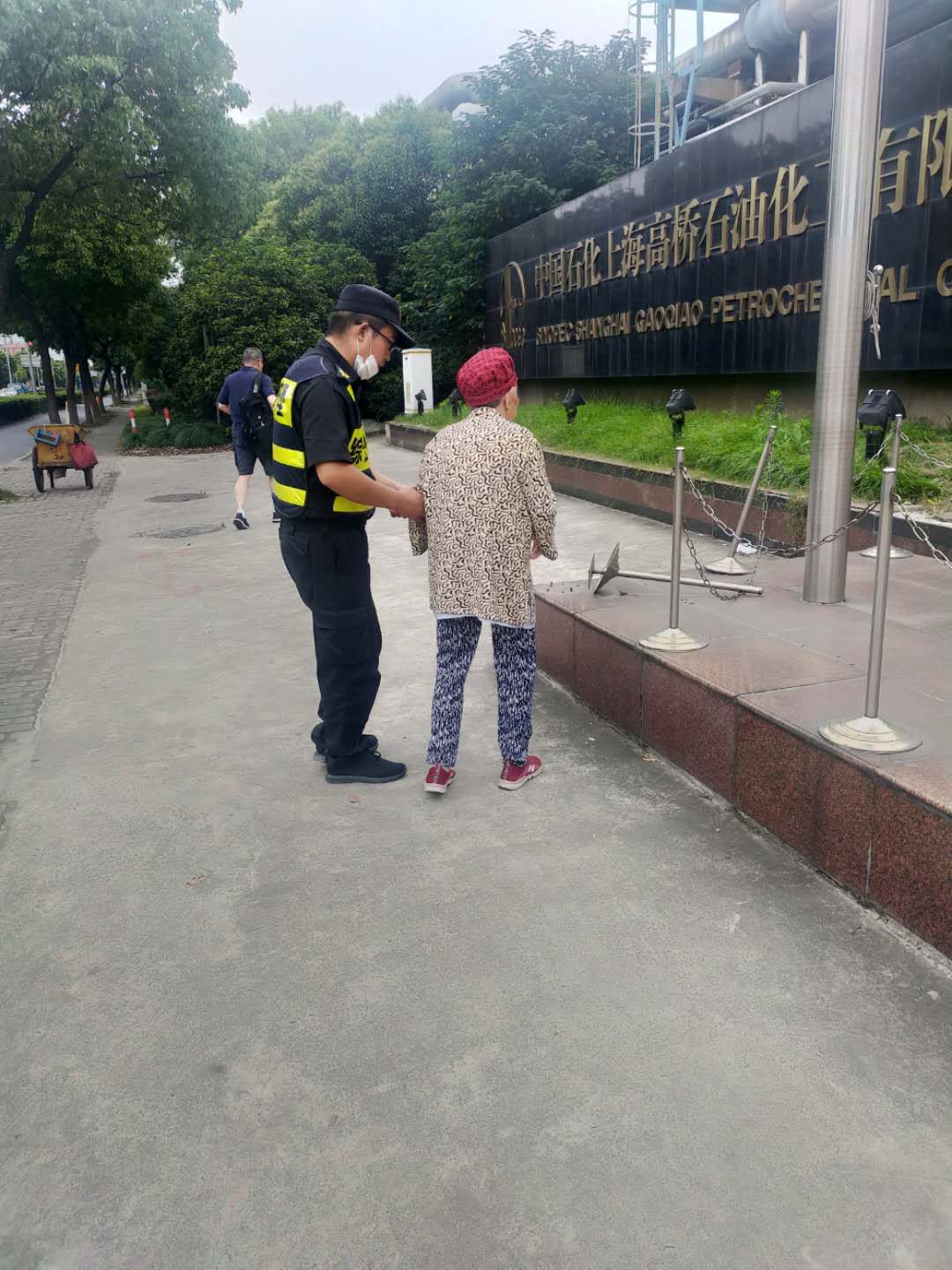 7月7日18:00,宗保公司駐高橋市容項目隊員王金齊、李少秋巡邏至浦東北路花山路時(shí),看到一位老阿姨在機動(dòng)車(chē)道上徘徊,眼神還有些許驚慌。
