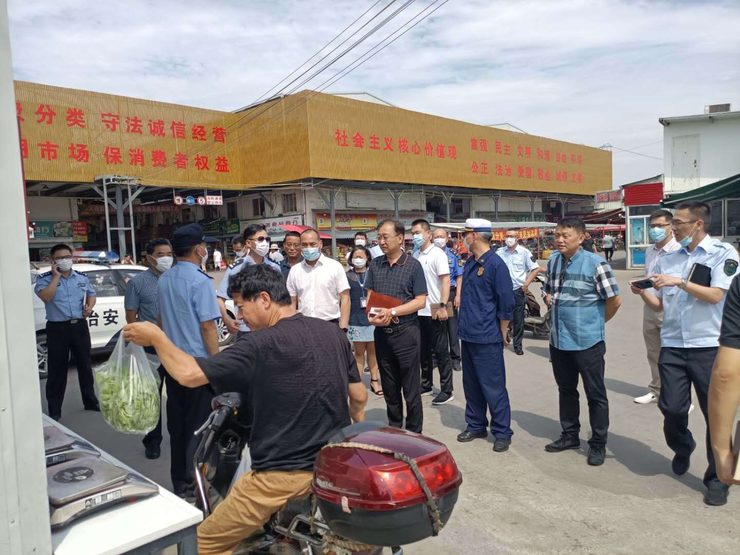 顧乃明副書(shū)記聽(tīng)取了農貿市場(chǎng)疫情防控工作情況匯報,肯定了農貿市場(chǎng)的工作。同時(shí),對宗保公司駐三林喜地農貿市場(chǎng)的隊員們表示慰問(wèn),對隊員們在炎炎的烈日下依然堅守工作崗位,履職盡責的敬業(yè)精神給予充分肯定和贊揚。